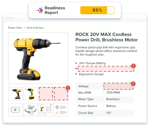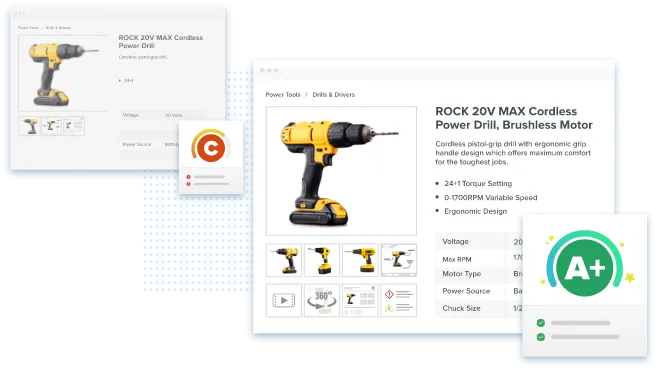 High-performing product listings drive conversions. Catsy helps you fill content gaps, group product variants, and bring all your digital assets together to achieve channel compliance and maximize discoverability.